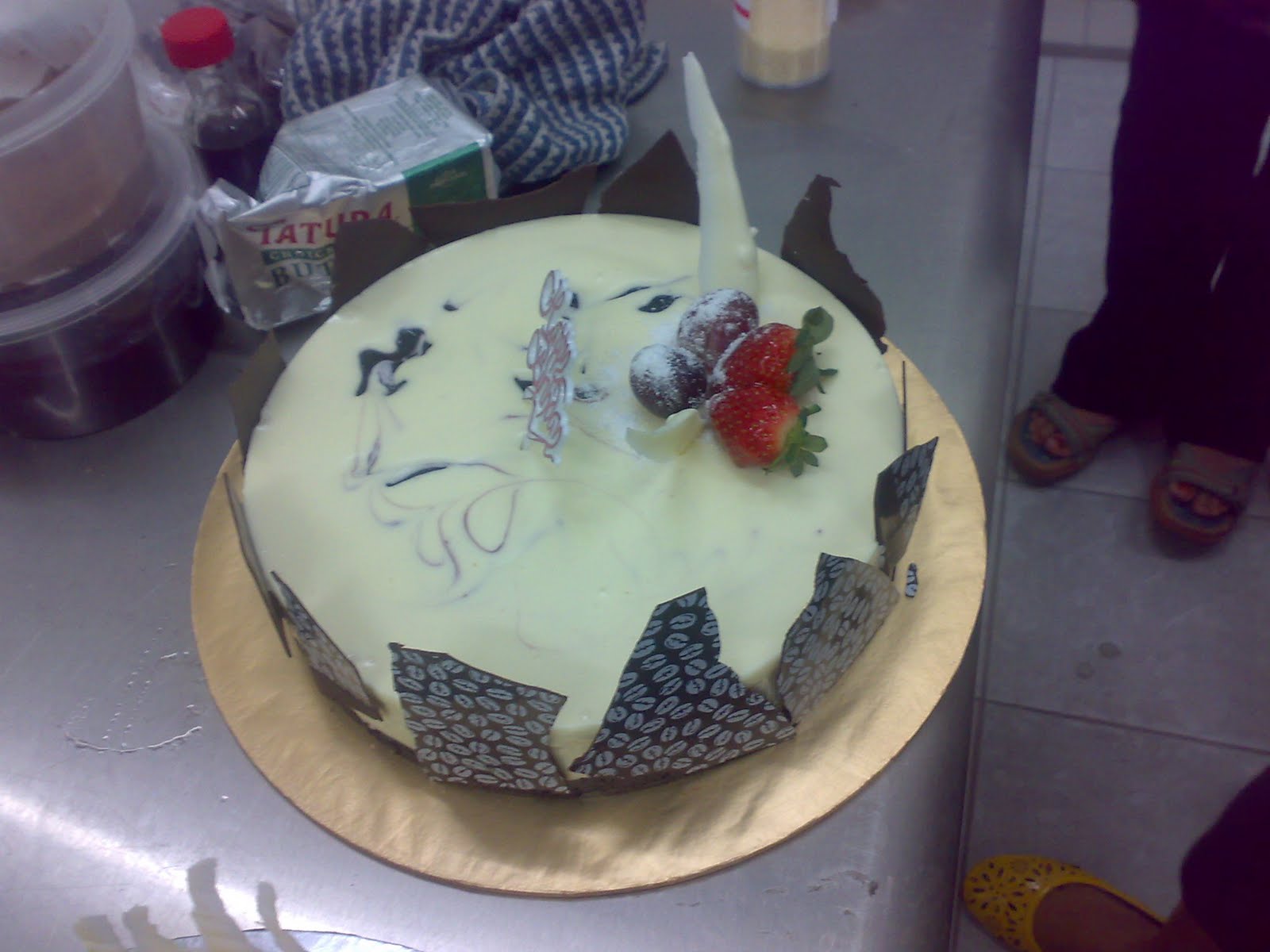 Kek coklat ini ditempah oleh Puan Hindun untuk pertunangan anak buahnya. Bersama-sama kek ini, beliau juga telah menempah sebiji lagi kek karot dan sebiji kek gula hangus.